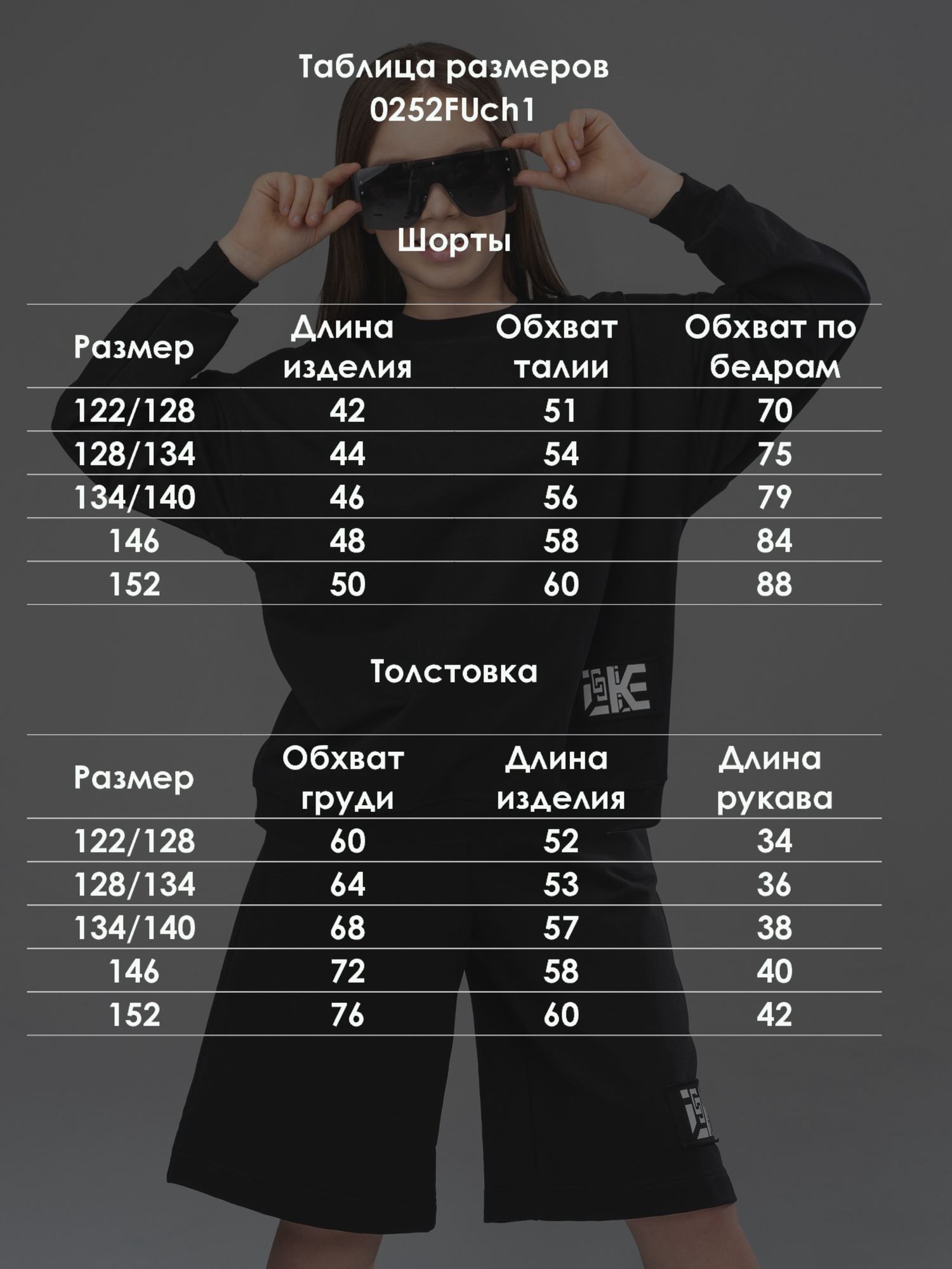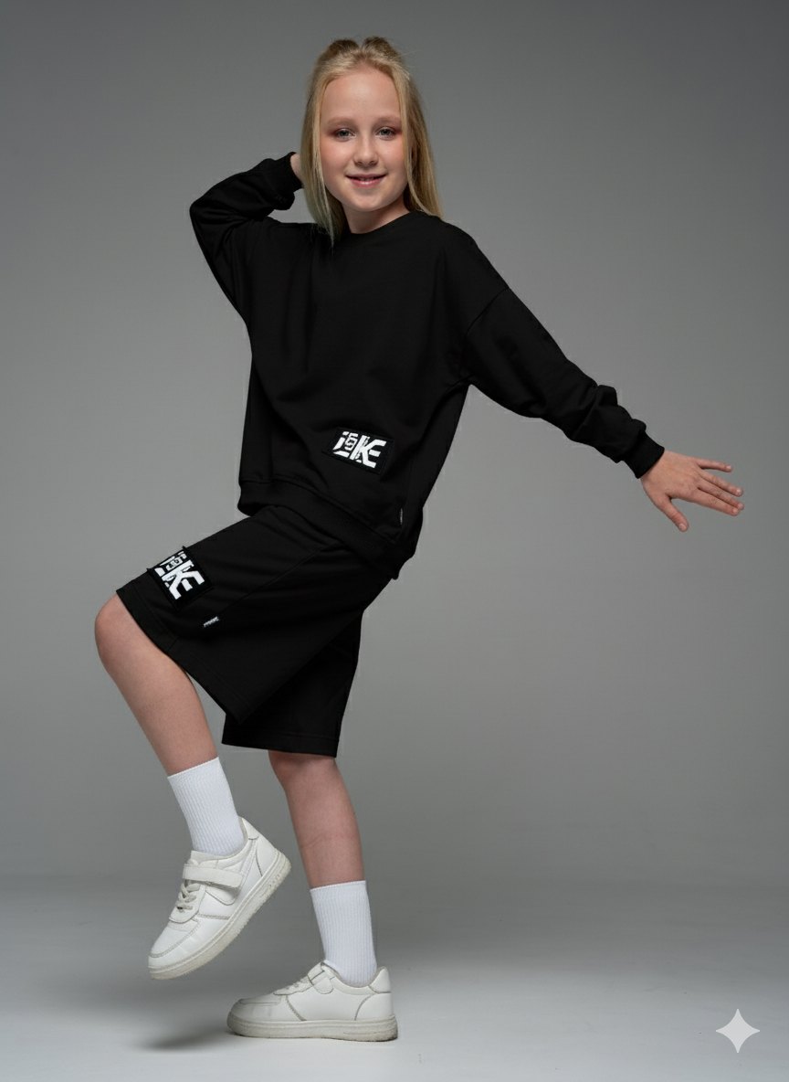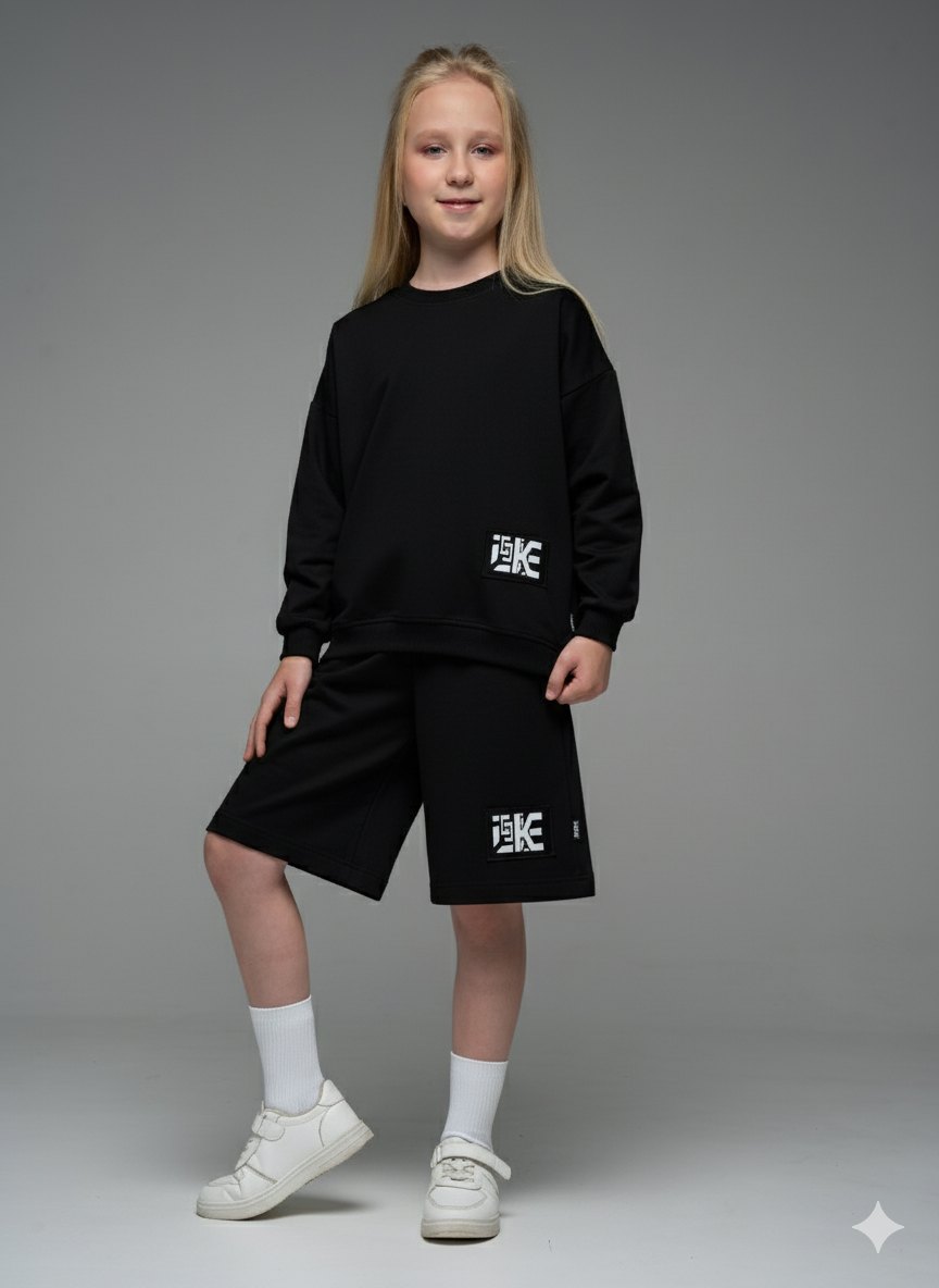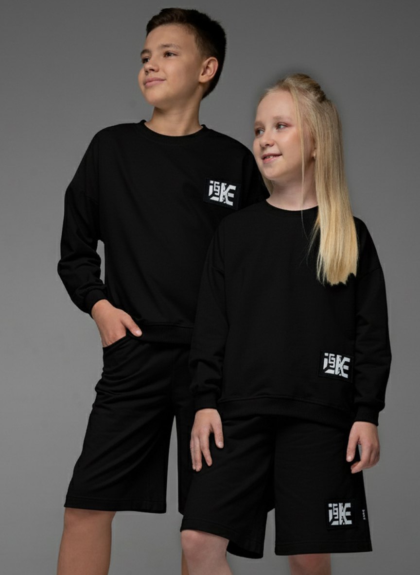 Трикотажный костюм с шортами и свитшотом из футера черного цвета .Футер 2х нитка высшего качества Пенье и имеет следующий состав ткани - 92% хлопок, 8% полиэстер. Плотный, приятный к телу материал, устойчив к частым стиркам, держит форму, не вытягивается, не теряет цвет и не скатывается. Модные шорты бермуды длиной до колен с карманами стильно смотрятся на девочках и мальчиках. Толстовку свободного кроя с круглой горловиной и длинными рукавами можно носить отдельно от шорт и она станет отличным дополнением к любому элементу детского гардероба. Покрой костюмчика оверсайз выглядит современно и стильно. Повседневный хлопковый костюм с шортами - базовая одежда для ваших детей в течении круглого года. Детский костюм подойдет для активного отдыха на свежем воздухе, путешествий, занятий спортом, на каждый день в детский сад и как спортивная форма на физкультуру. Также это яркий стильный вариант детской одежды для пляжа и моря. Данный набор станет прекрасным подарком день рождения или любой другой праздник. Изделие выполнено из трикотажа премиального качества - ПЕНЬЕ, с содержанием хлопка более 92%