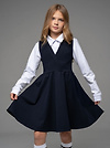 Стильный школьный сарафан из футера черного цвета для девочки, отрезной по линии талии. Юбка расклешенная, со сборками, лиф с имитацией запаха. Изделие выполнено из трикотажа премиального качества - ПЕНЬЕ, с содержанием хлопка более 92%