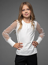 Нарядная блуза из кулирки белого цвета для девочки. По горловине - изящная сборка из небольших складок. Рукава из нежной сетки, по низу рукава - манжета. Изделие выполнено из трикотажа премиального качества - ПЕНЬЕ, с содержанием хлопка более 95%