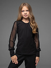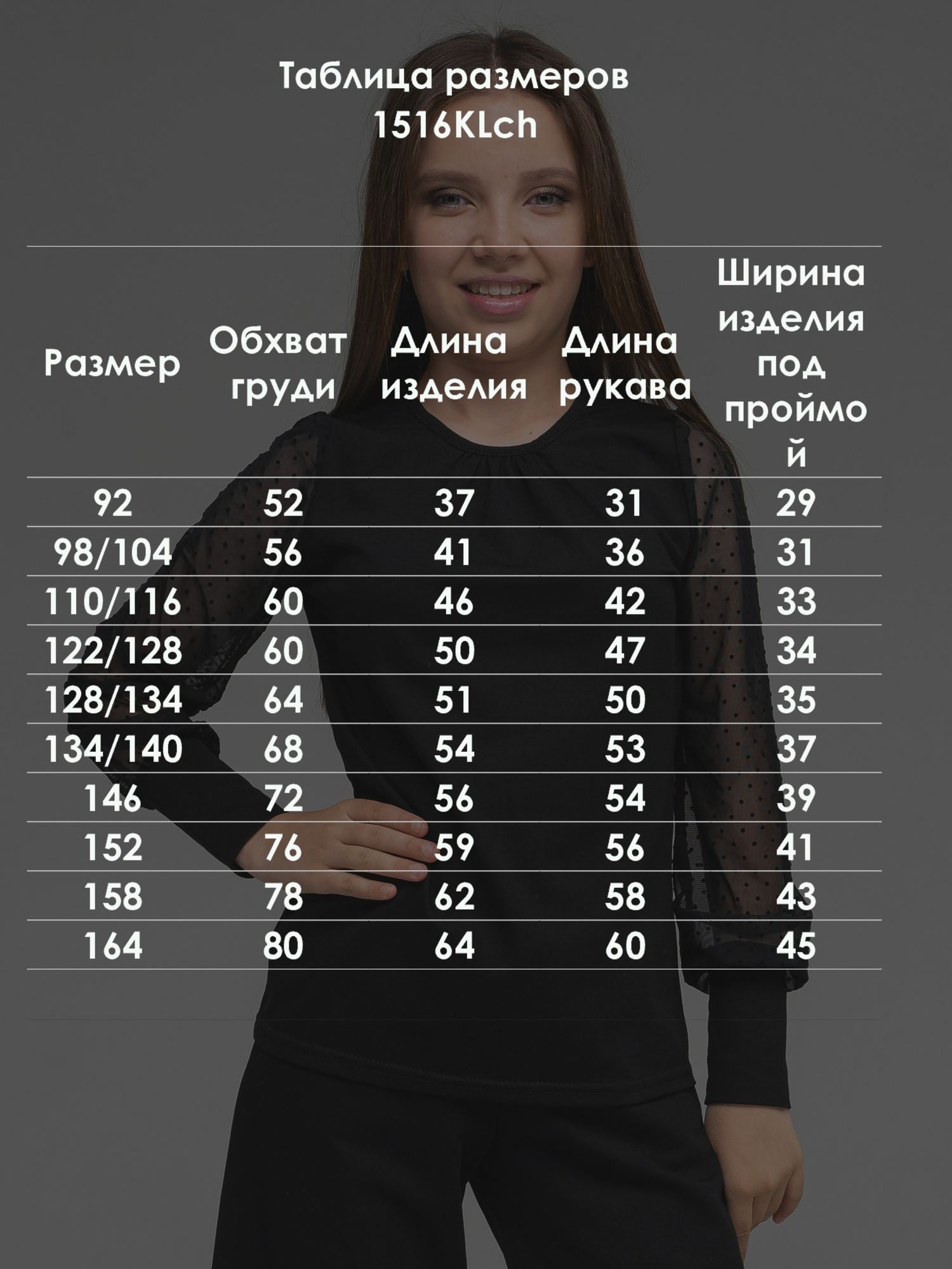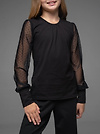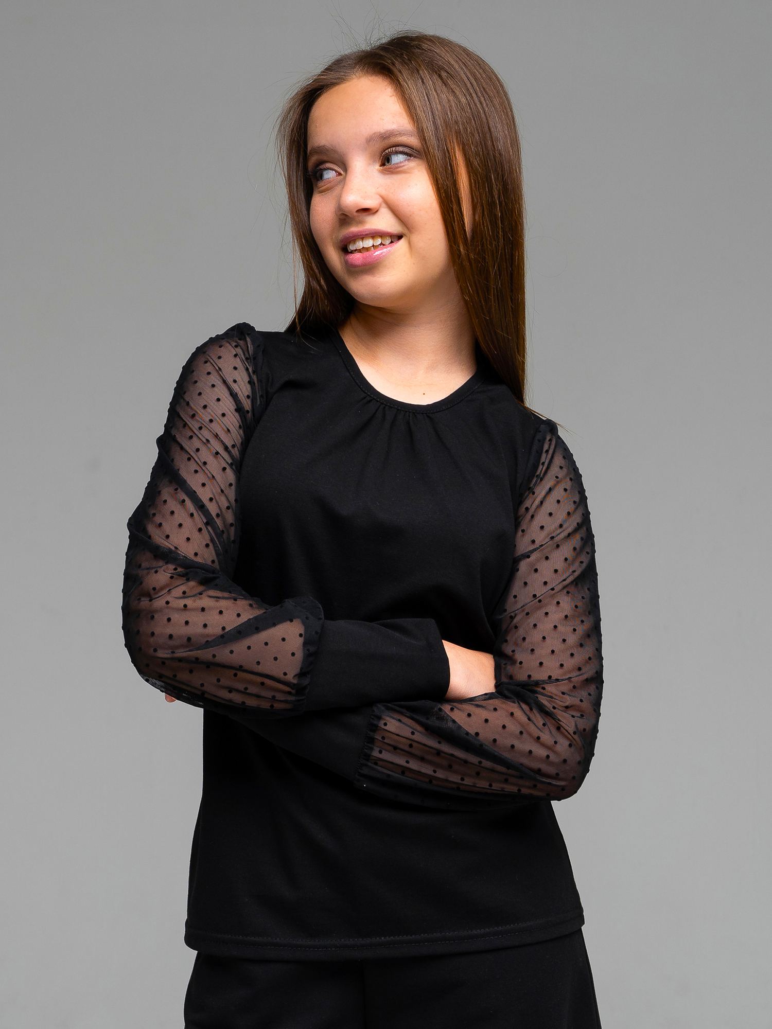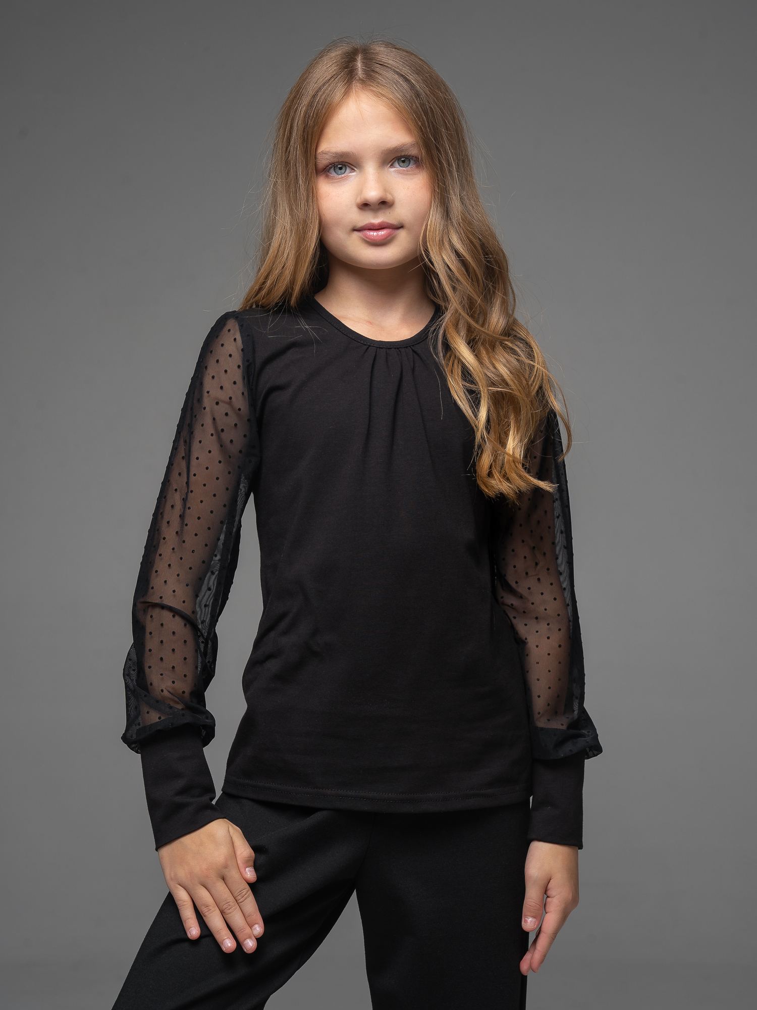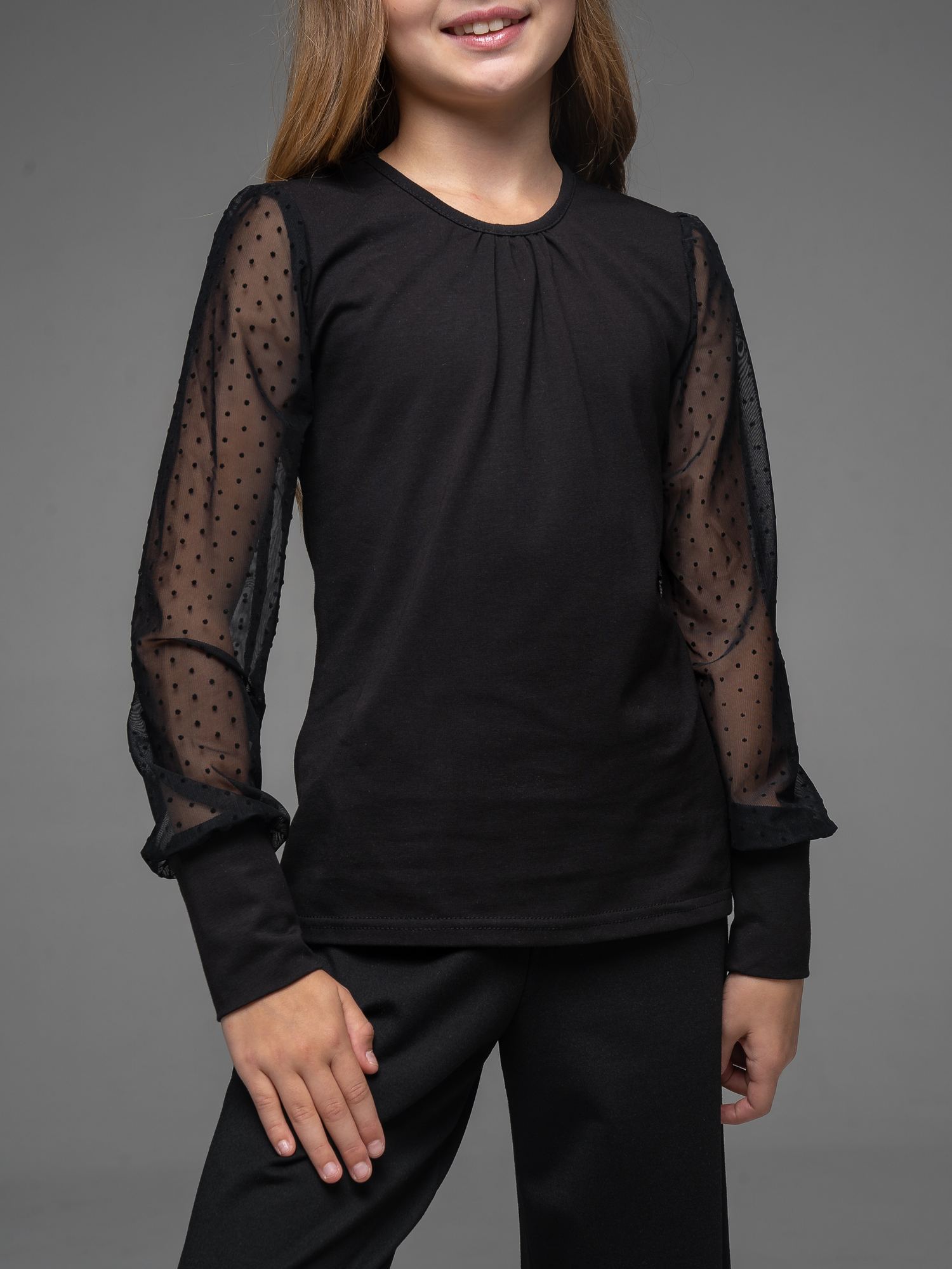 Нарядная блуза из кулирки черного цвета для девочки. По горловине - изящная сборка из небольших складок. Рукава из нежной сетки, по низу рукава - манжета. Изделие выполнено из трикотажа премиального качества - ПЕНЬЕ, с содержанием хлопка более 95%