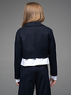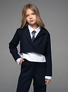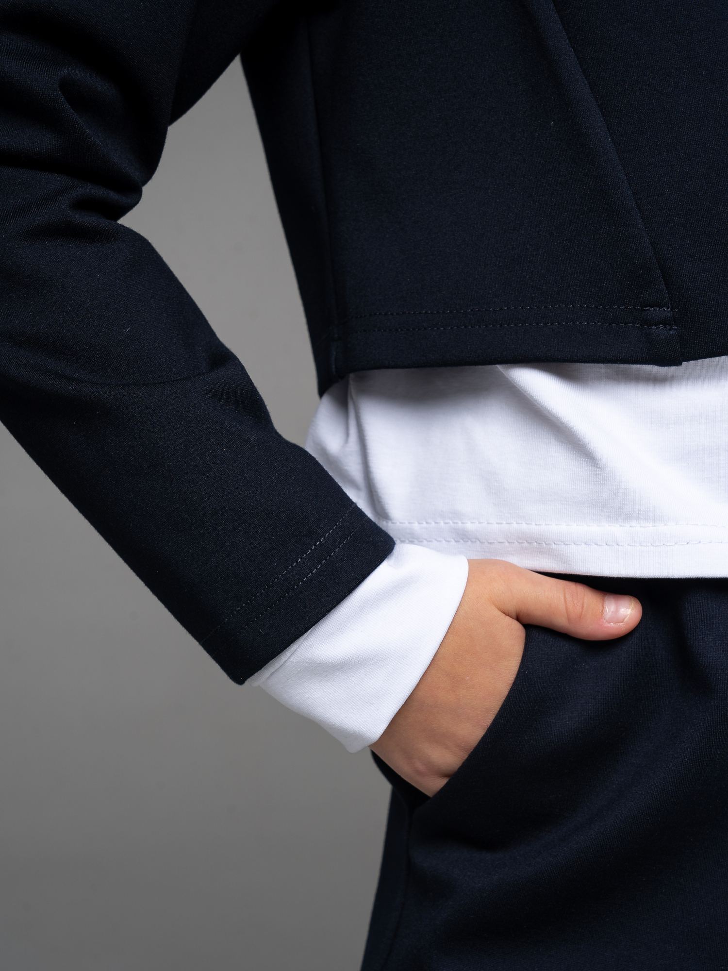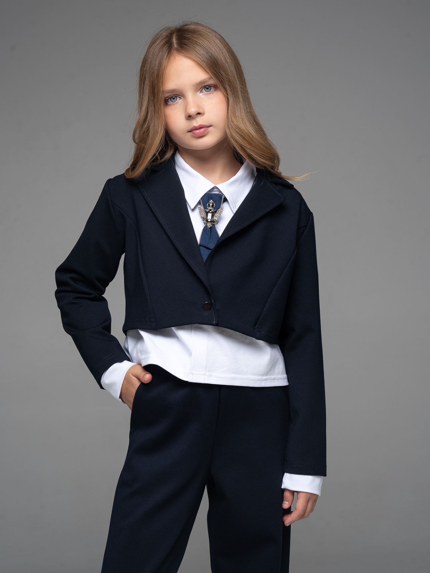 "Школьные будни – не просто обязанность, но и возможность проявить стиль и индивидуальность. Идеальным дополнением школьного гардероба вашей малышки станет укороченный пиджак из джерси темно-синего цвета для девочки .