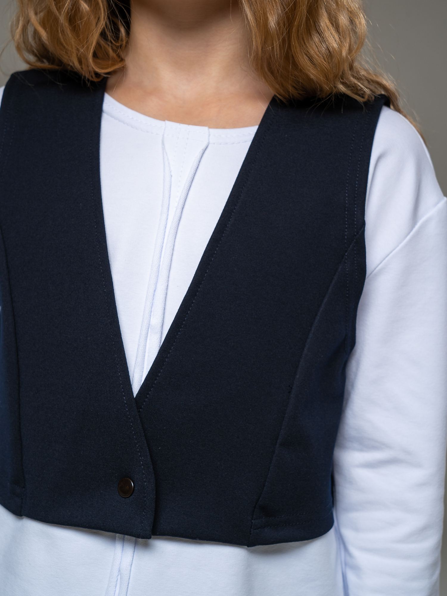 "Школьные будни – не просто обязанность, но и возможность проявить стиль и индивидуальность. Идеальным дополнением школьного гардероба вашей малышки станет укороченный жилет из джерси темно-синего цвета для девочки .