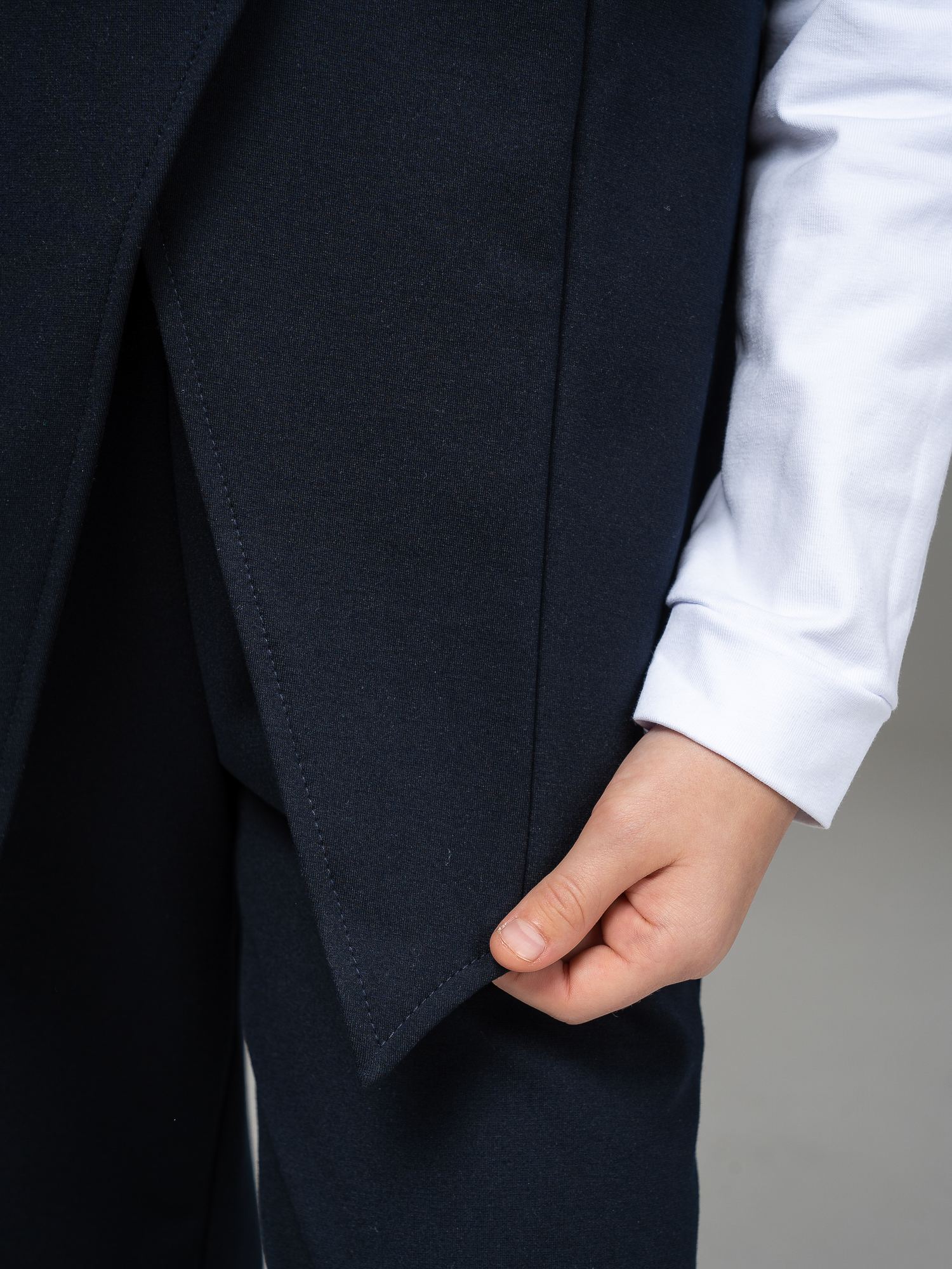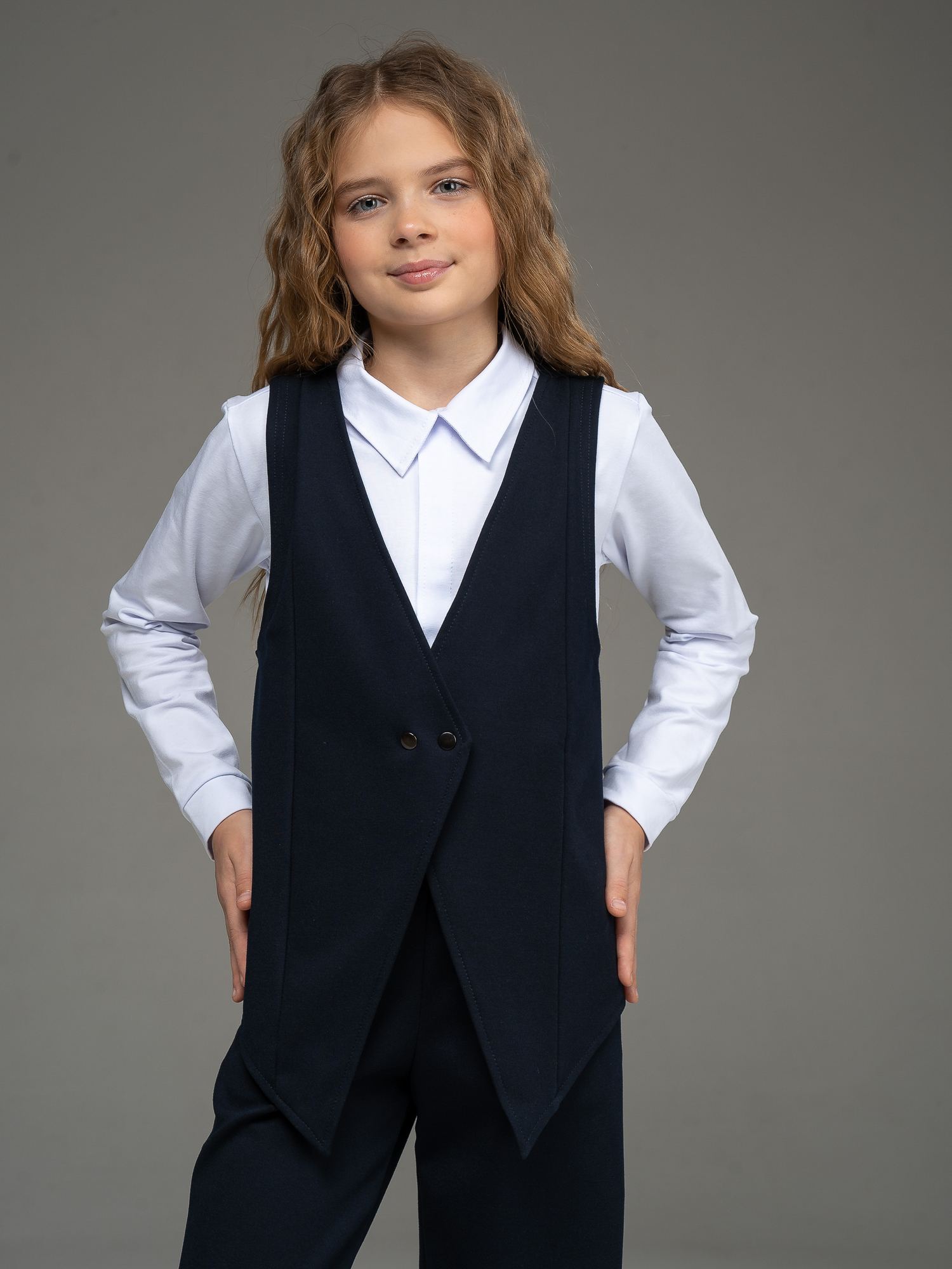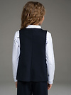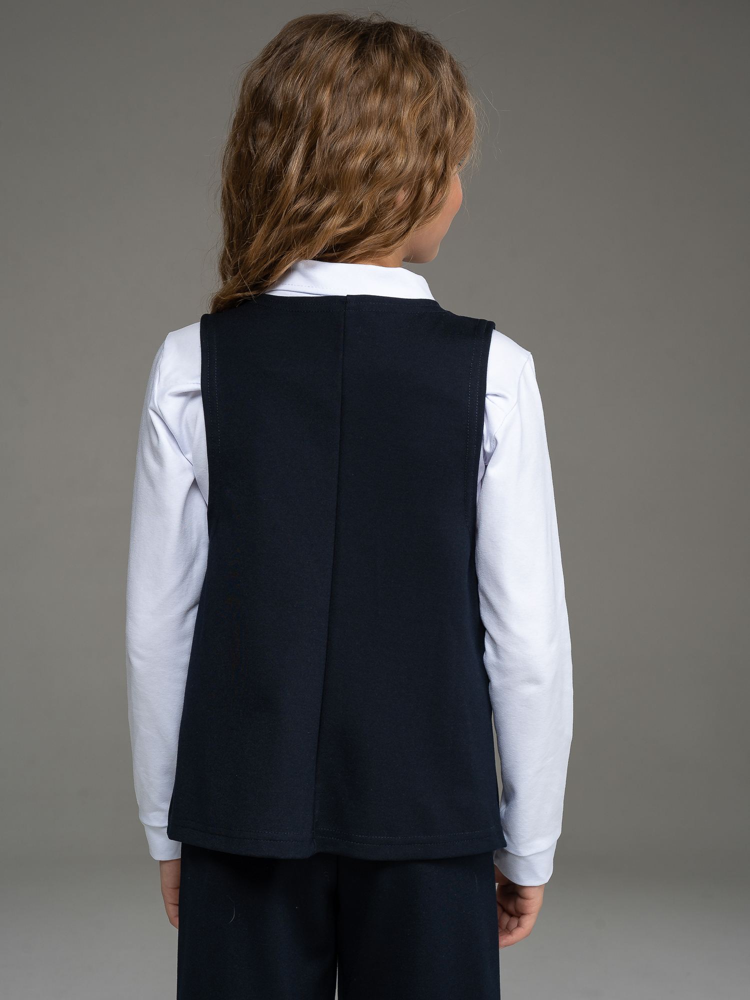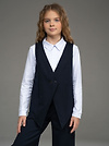 "Школьные будни – не просто обязанность, но и возможность проявить стиль и индивидуальность. Идеальным дополнением школьного гардероба вашей малышки станет удлиненный жилет из джерси темно-синего цвета для девочки .