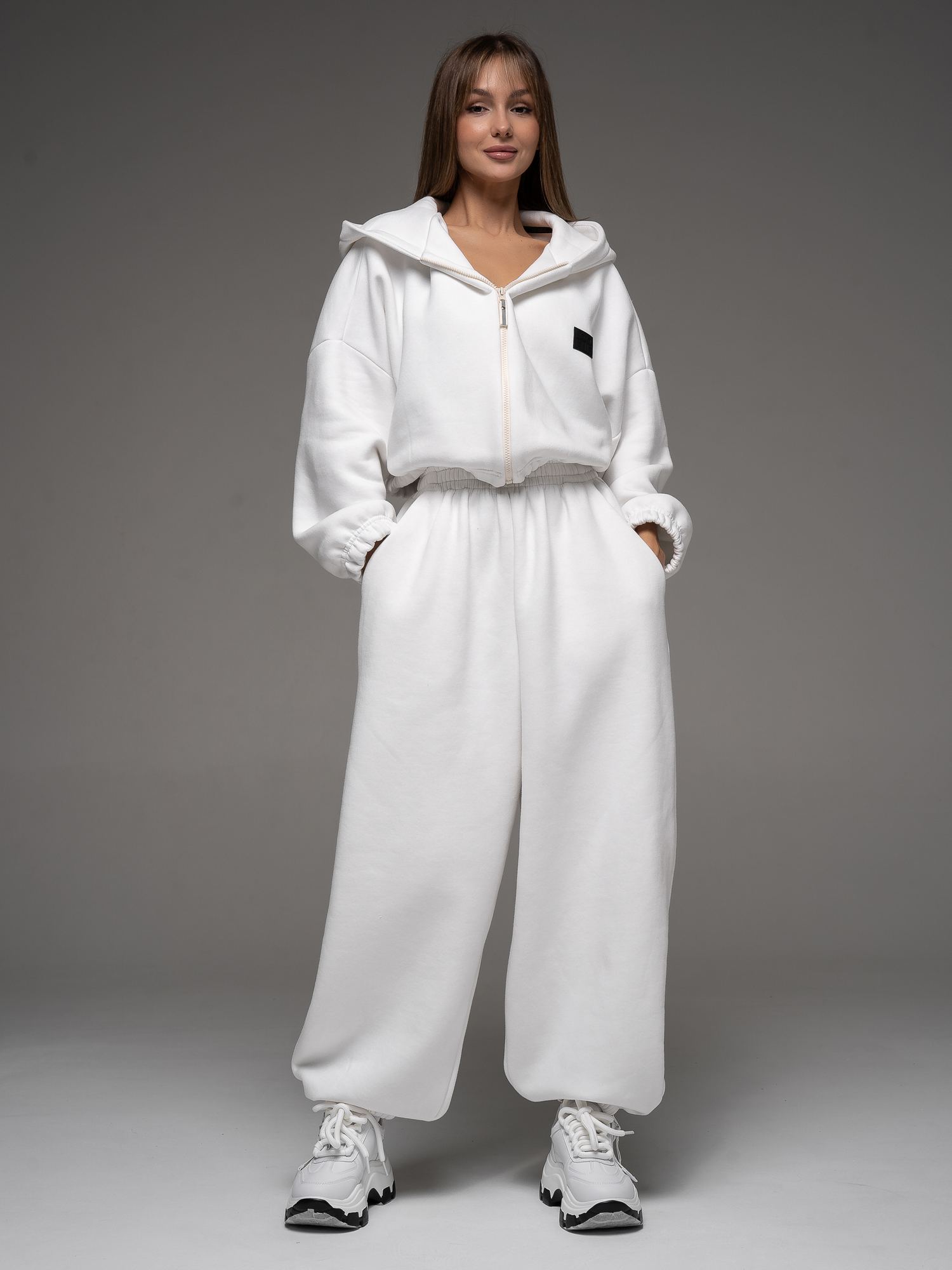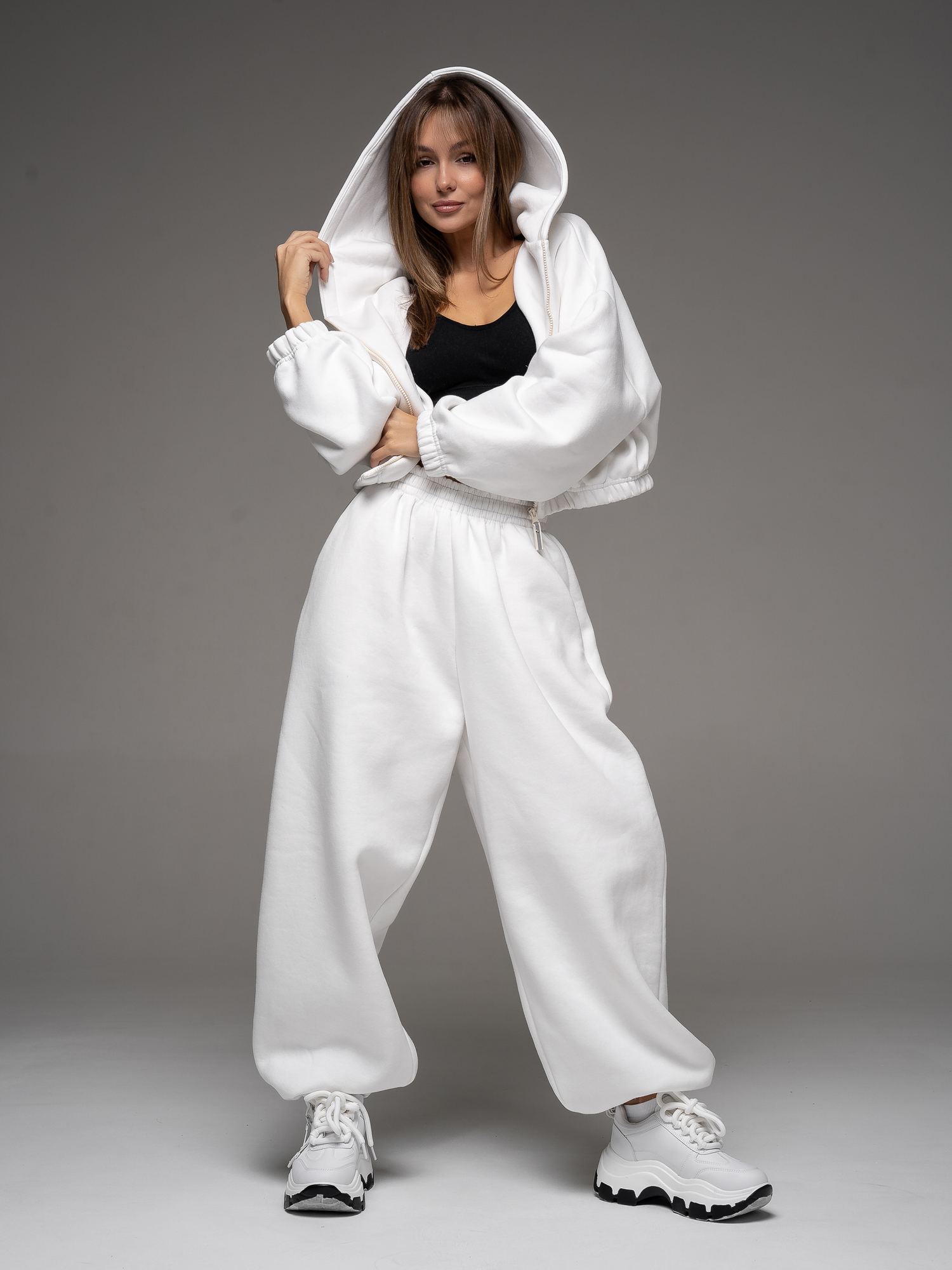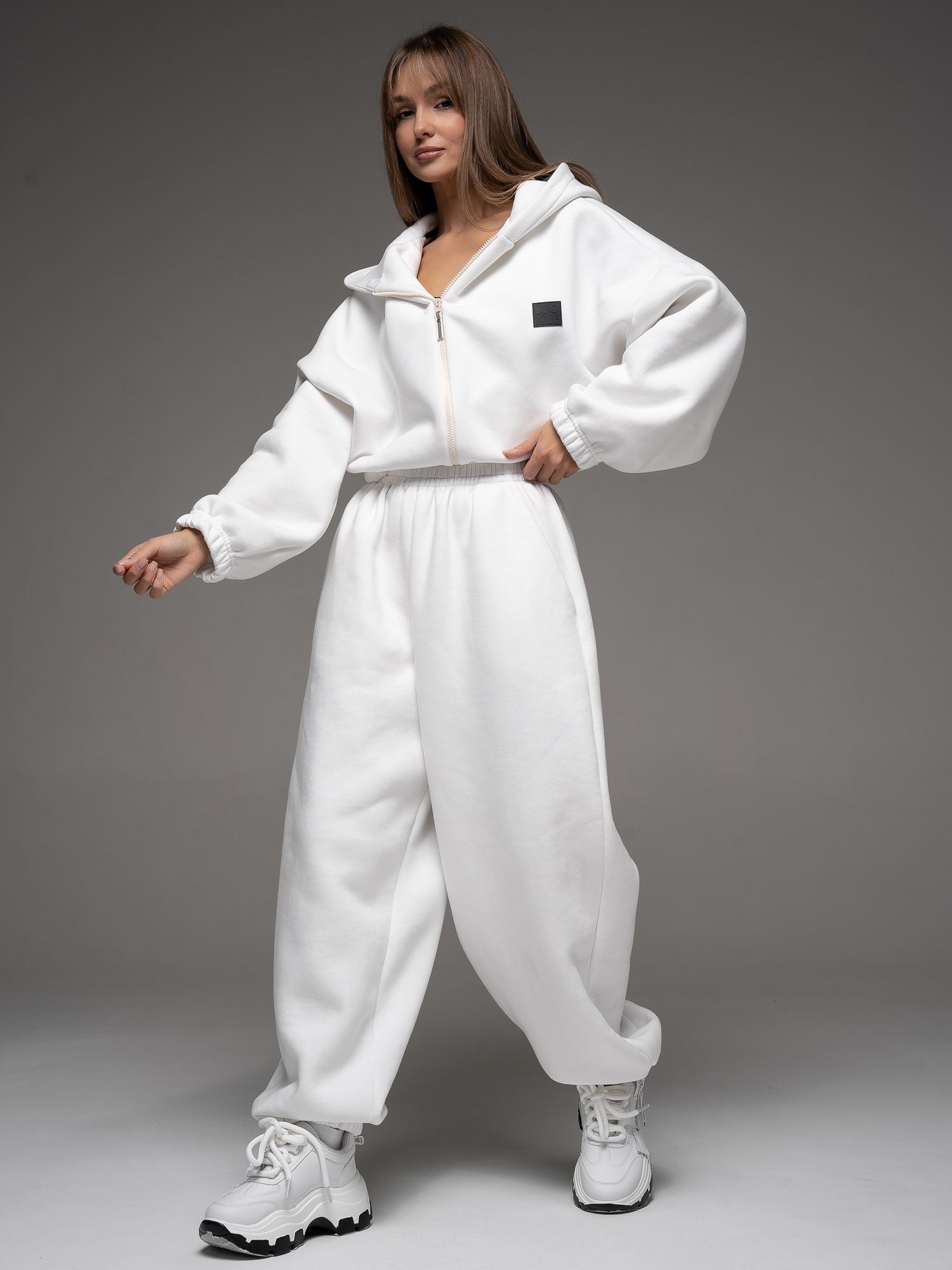 Женский костюм с начесом,с стиле "Спорт-шик" состоящий из брюк и кофты с капюшоном на молнии. Толстовка укороченная на молнии свободного силуэта с капюшоном и длинными рукавами. Низ рукавов и толстовки- на резинке. Брюки свободного силуэта с боковыми карманами, по талии и низу изделия- резинка. Универсальный спортивный костюм женский для повседневной жизни, выполнен из хлопкового футера с начесом- ткань средней плотности, подойдет на весну и осень, (демисезон) и зиму. Наш трикотажный брючный костюм подойдет для прогулок и занятий спортом. Спортивный комплект послужит прекрасным вариантом для прогулок и походов. Хлопковая свободная двойка прекрасно смотрится на девушках разного типа фигуры и благодаря свободной кофте оверсайз подойдет и беременным девушкам. Повседневный трикотажный комплект прекрасно впишется в любой гардероб, т.к. штаны и кофту можно сочетать с любыми вещами из гардероба! Кофту на молнии и спортивки можно носить по отдельности, сочетая их с различными элементами спортивной и повседневной одежды. Плотное трикотажное полотно футер с начесом, гладкое снаружи, изнутри - мягкое и приятное. В состав хлопковой ткани для эластичности и износостойкости добавлен полиэстер. Он универсален! И в поездке или путешествии будет незаменимым вариантом как на улицу, так и в спортзал. Наша стильная спортивная новинка станет удачным подарком подруге, сестре или любимой девушке на день рождения и любой другой праздник. Изделие выполнено из трикотажа премиального качества - ПЕНЬЕ, с содержанием хлопка более 80%