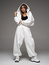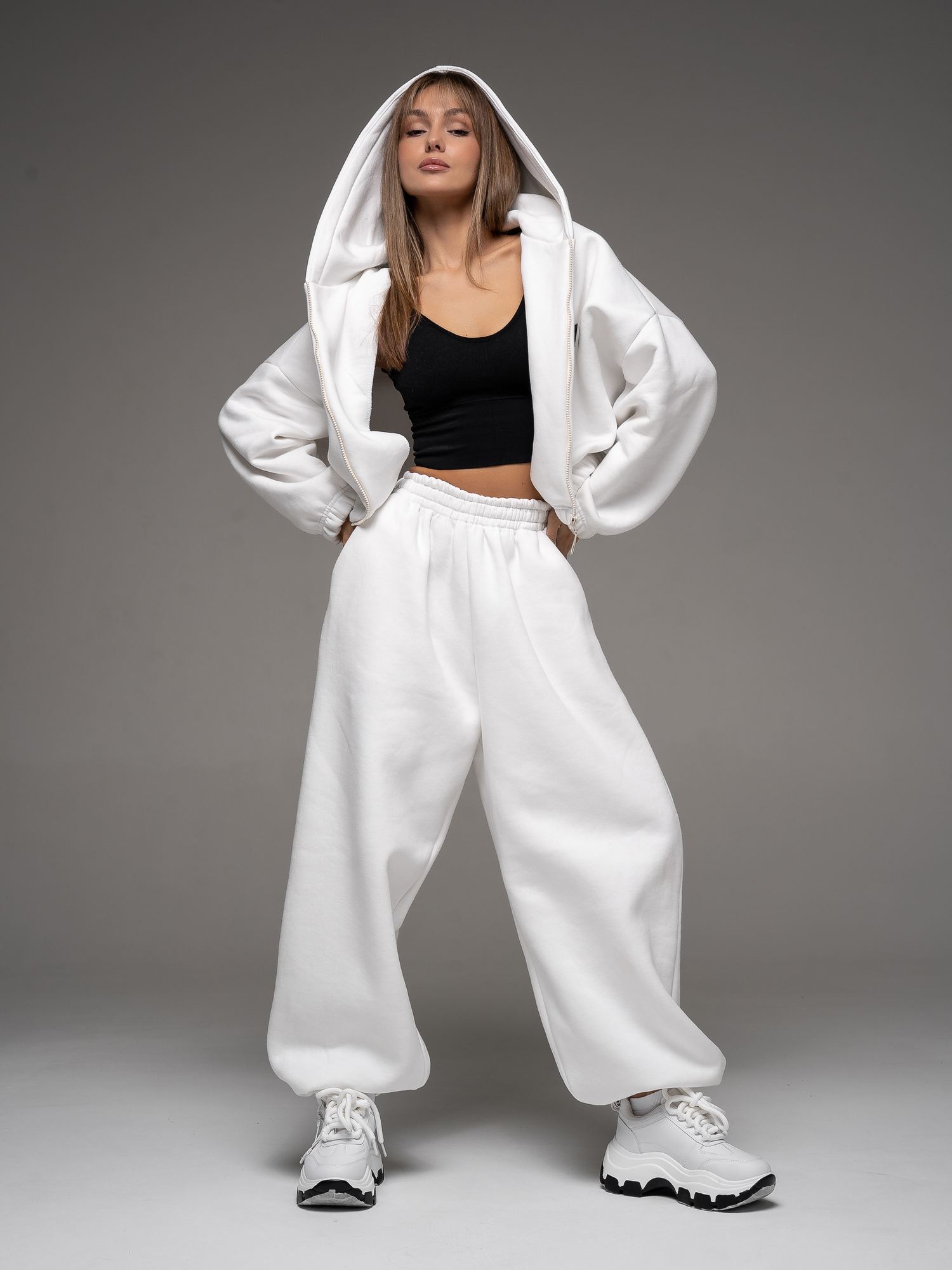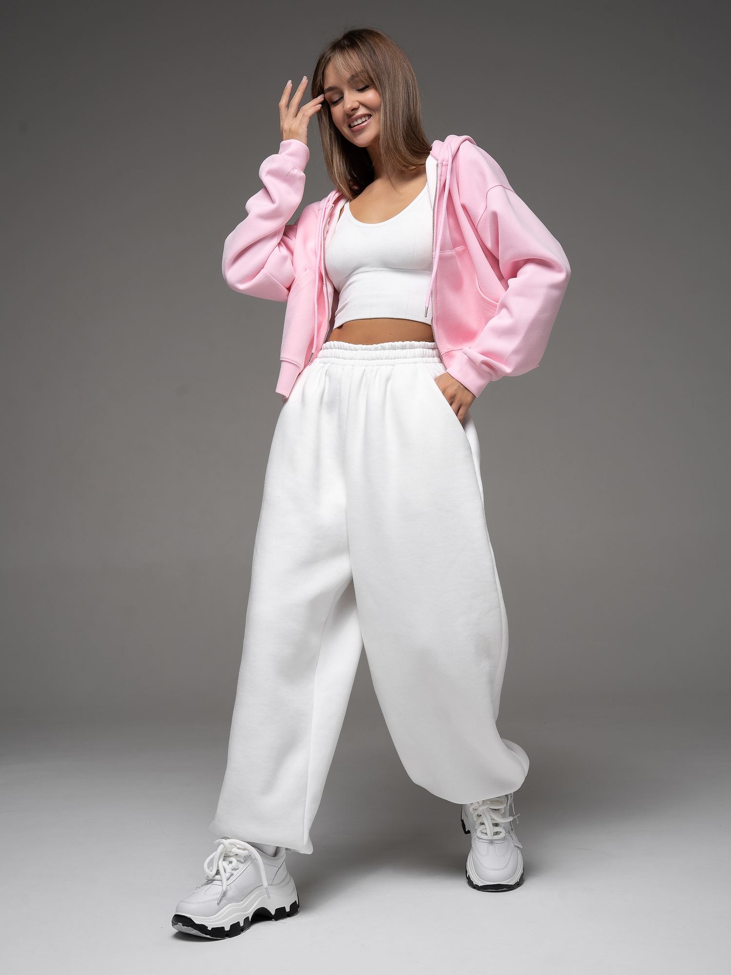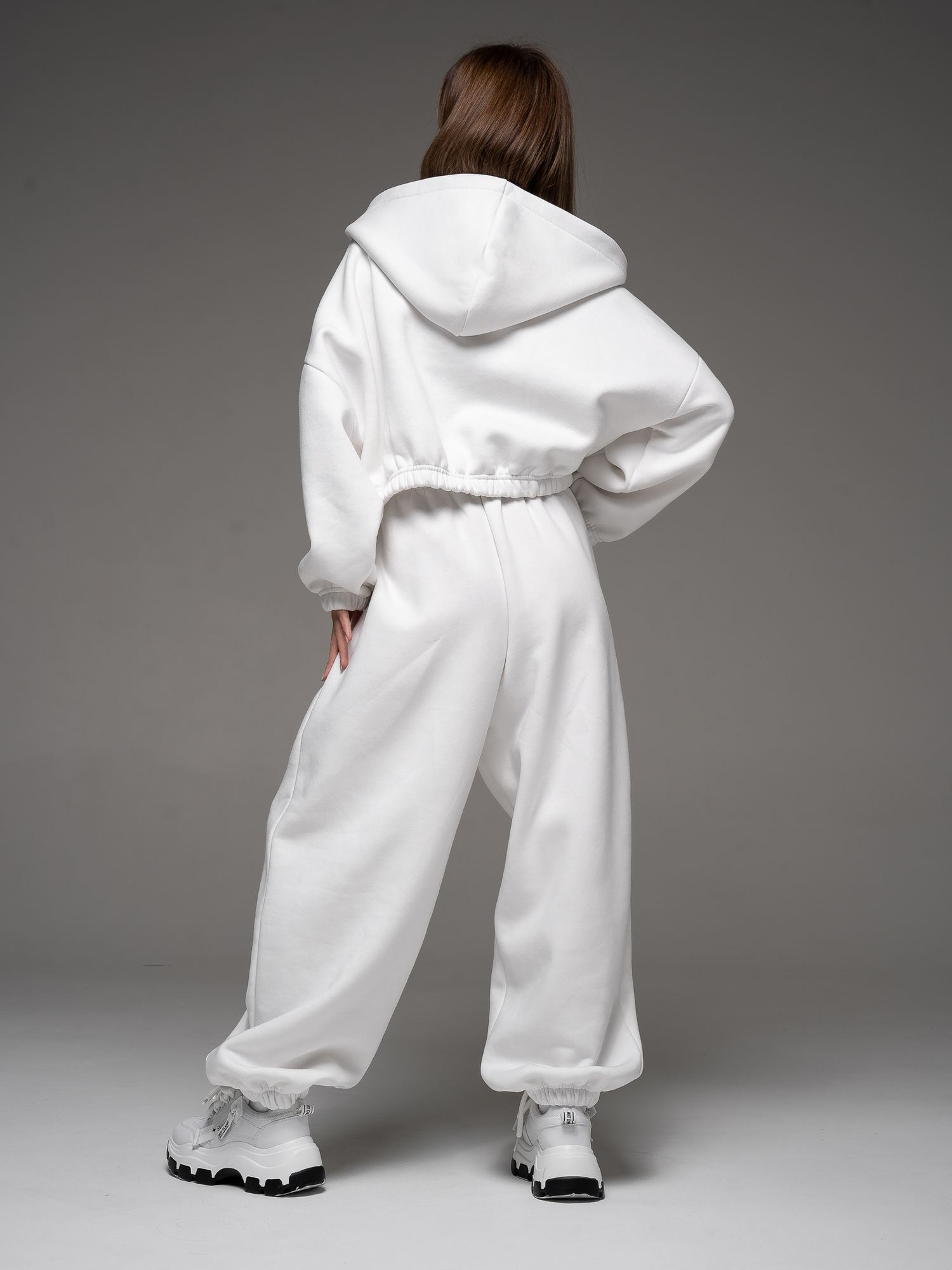 Женский костюм с начесом,с стиле "Спорт-шик" состоящий из брюк и кофты с капюшоном на молнии. Толстовка укороченная на молнии свободного силуэта с капюшоном и длинными рукавами. Низ рукавов и толстовки- на резинке. Брюки свободного силуэта с боковыми карманами, по талии и низу изделия- резинка. Универсальный спортивный костюм женский для повседневной жизни, выполнен из хлопкового футера с начесом- ткань средней плотности, подойдет на весну и осень, (демисезон) и зиму. Наш трикотажный брючный костюм подойдет для прогулок и занятий спортом. Спортивный комплект послужит прекрасным вариантом для прогулок и походов. Хлопковая свободная двойка прекрасно смотрится на девушках разного типа фигуры и благодаря свободной кофте оверсайз подойдет и беременным девушкам. Повседневный трикотажный комплект прекрасно впишется в любой гардероб, т.к. штаны и кофту можно сочетать с любыми вещами из гардероба! Кофту на молнии и спортивки можно носить по отдельности, сочетая их с различными элементами спортивной и повседневной одежды. Плотное трикотажное полотно футер с начесом, гладкое снаружи, изнутри - мягкое и приятное. В состав хлопковой ткани для эластичности и износостойкости добавлен полиэстер. Он универсален! И в поездке или путешествии будет незаменимым вариантом как на улицу, так и в спортзал. Наша стильная спортивная новинка станет удачным подарком подруге, сестре или любимой девушке на день рождения и любой другой праздник. Изделие выполнено из трикотажа премиального качества - ПЕНЬЕ, с содержанием хлопка более 80%