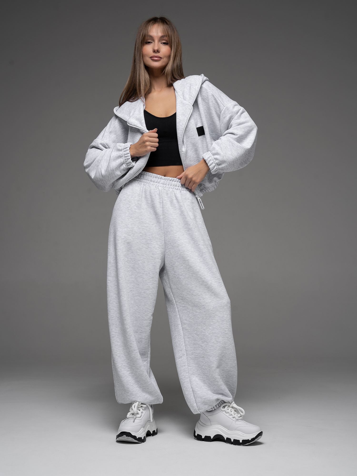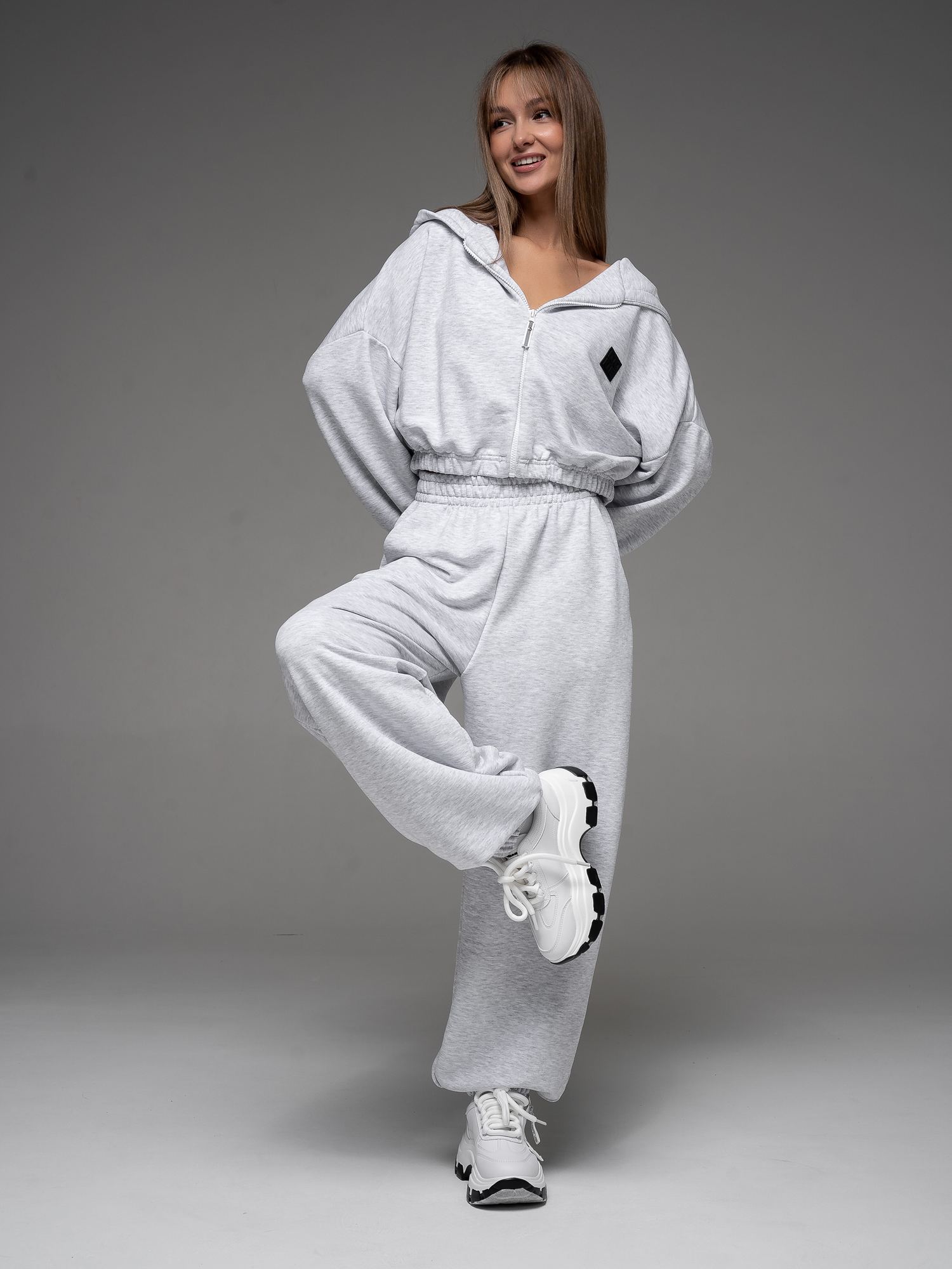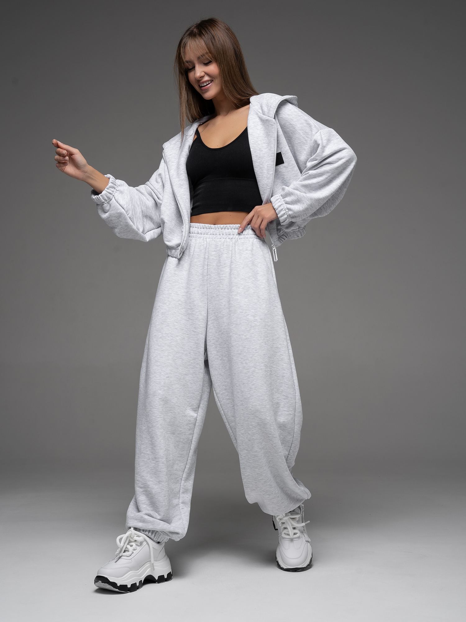 Женский костюм из футера(3х нитка) серого цвета без начеса,с стиле "Спорт-шик" состоящий из брюк и кофты с капюшоном на молнии. Толстовка укороченная на молнии свободного силуэта с капюшоном и длинными рукавами. Низ рукавов и толстовки- на резинке. Брюки свободного силуэта с боковыми карманами, по талии и низу изделия- резинка. Универсальный спортивный костюм женский для повседневной жизни, выполнен из хлопкового футера 3х нитки (без начеса)- ткань средней плотности, подойдет на весну и осень, (демисезон) и прохладное лето. Наш трикотажный брючный костюм подойдет для занятий спортом, фитнеса, пилатеса, танцев и йоги. Так же в качестве спортивной формы для занятия спортом. Спортивный комплект послужит прекрасным вариантом для прогулок и походов. Хлопковая свободная двойка прекрасно смотрится на девушках разного типа фигуры и благодаря свободной кофте оверсайз подойдет и беременным девушкам. Повседневный трикотажный комплект прекрасно впишется в любой гардероб, т.к. штаны и кофту можно сочетать с любыми вещами из гардероба! Кофту на молнии и спортивки можно носить по отдельности, сочетая их с различными элементами спортивной и повседневной одежды. Плотное трикотажное полотно футер 3-х нитка без начеса, гладкое снаружи, изнутри - мягкое и приятное. В состав хлопковой ткани для эластичности и износостойкости добавлен полиэстер. Он универсален! И в поездке или путешествии будет незаменимым вариантом как на улицу, так и в спортзал. Наша стильная спортивная новинка станет удачным подарком подруге, сестре или любимой девушке на день рождения и любой другой праздник.