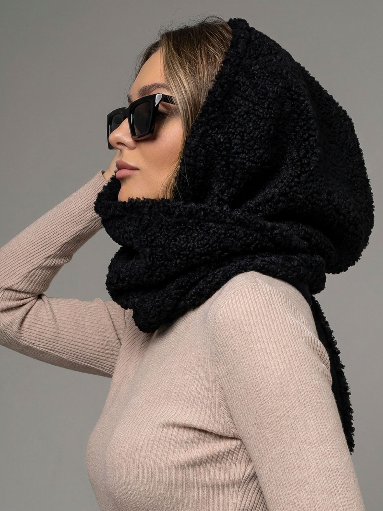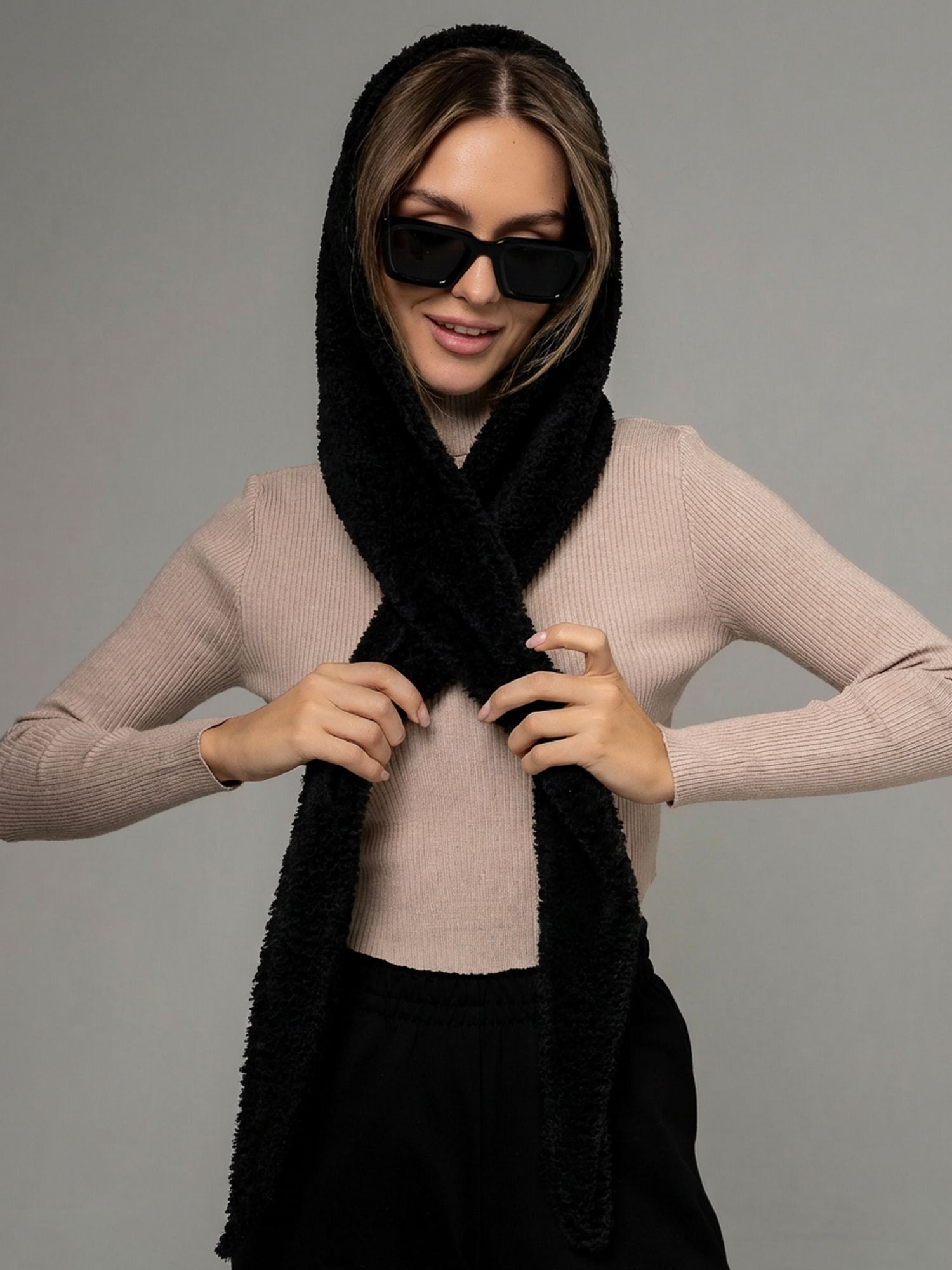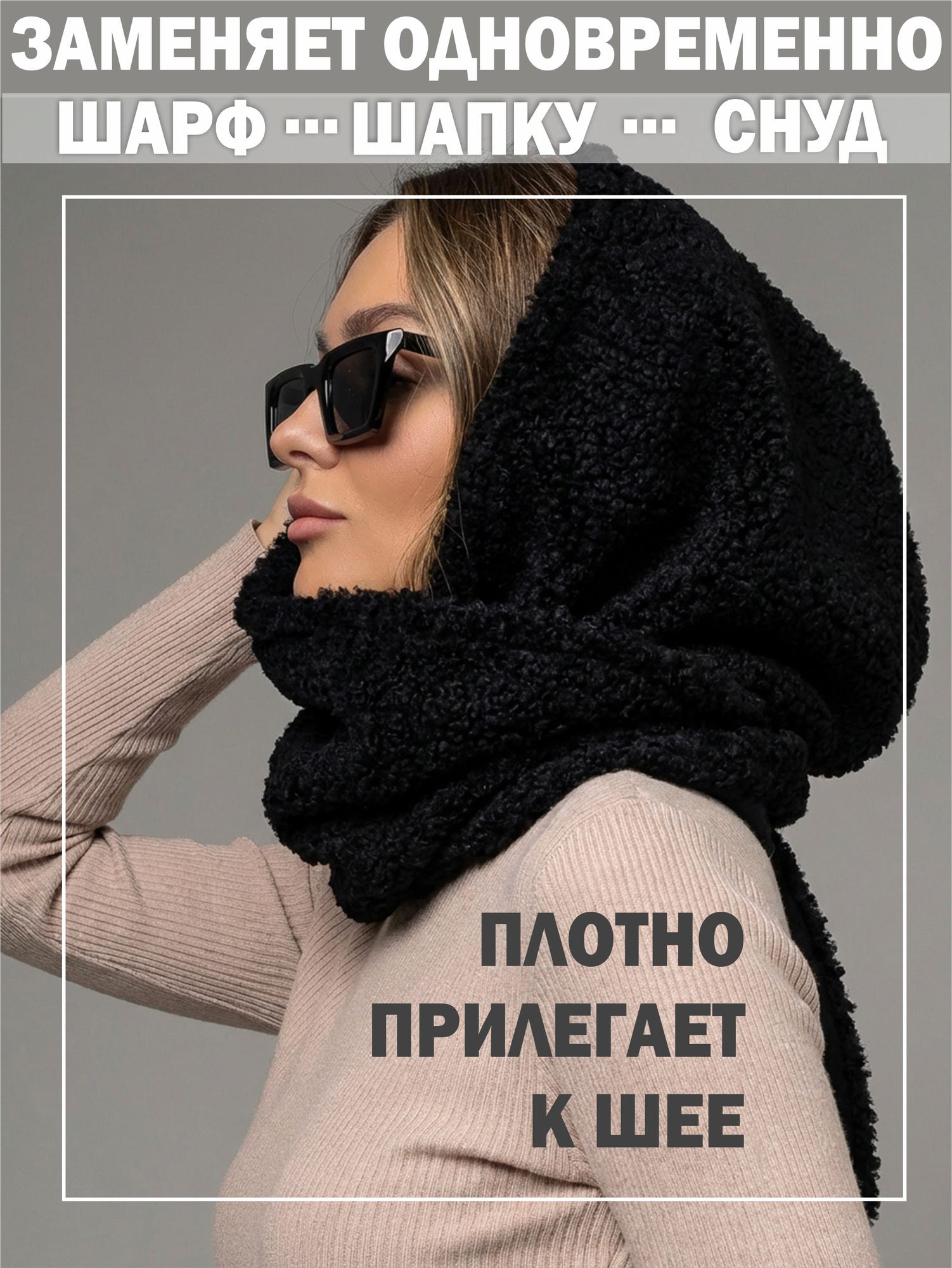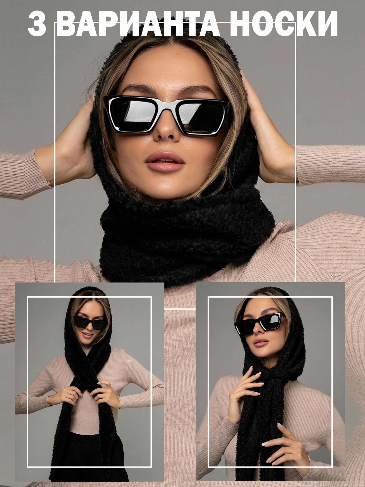 Капор - платок женский из шерпа черного цвета - тренд сезона. Имеет 2 варианта ношения: можно зафиксировать спереди на петличку, либо завязать как платок. Это универсальный головной убор, который сочетается с любой верхней одеждой, создавая стильный образ. Это отличная замена шапке, платку и шарфу, надежно закрывает шею и грудь от холодного воздуха. Плюшевый теплый капор из шерпы - идеален для длительных прогулок на свежем воздухе, путешествий, занятий спортом. В нем можно каждый день ходить на работу в офис, на учебу в школу или в институт. Не имеет ограничений по возрасту, подходит как взрослым, так и подросткам для повседневного, спортивного, городского, молодежного стиля. Капор можно взять с собой и надеть в случае непогоды весной и осенью."