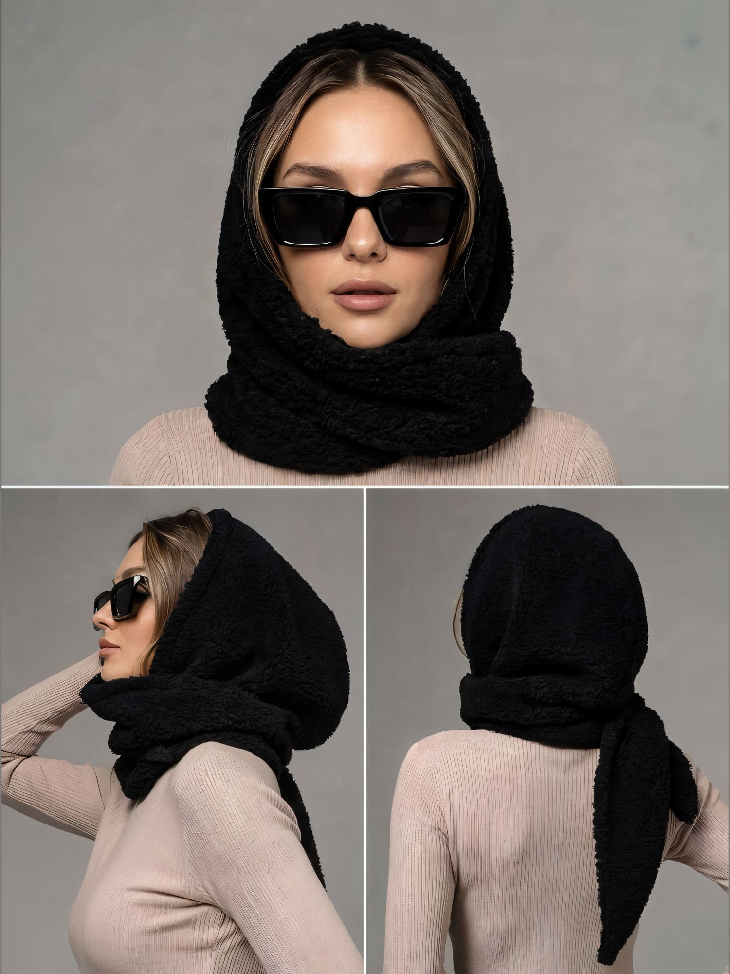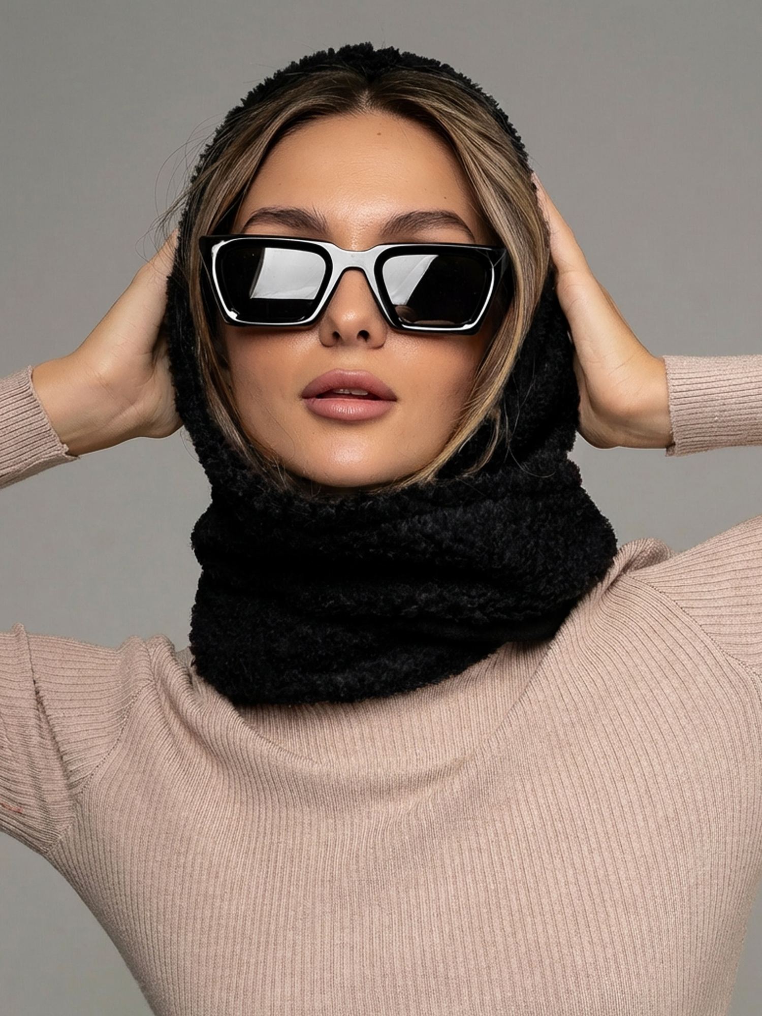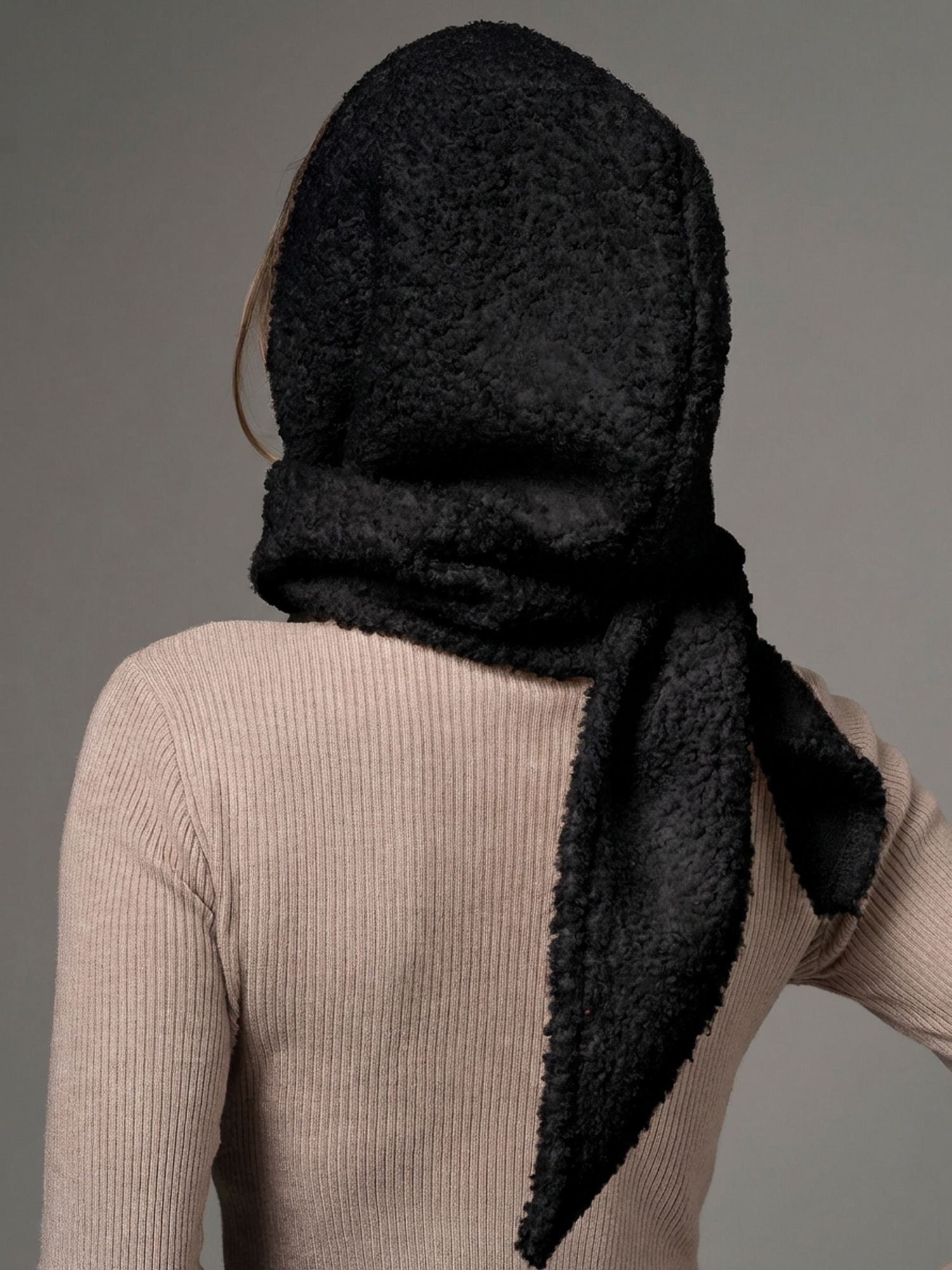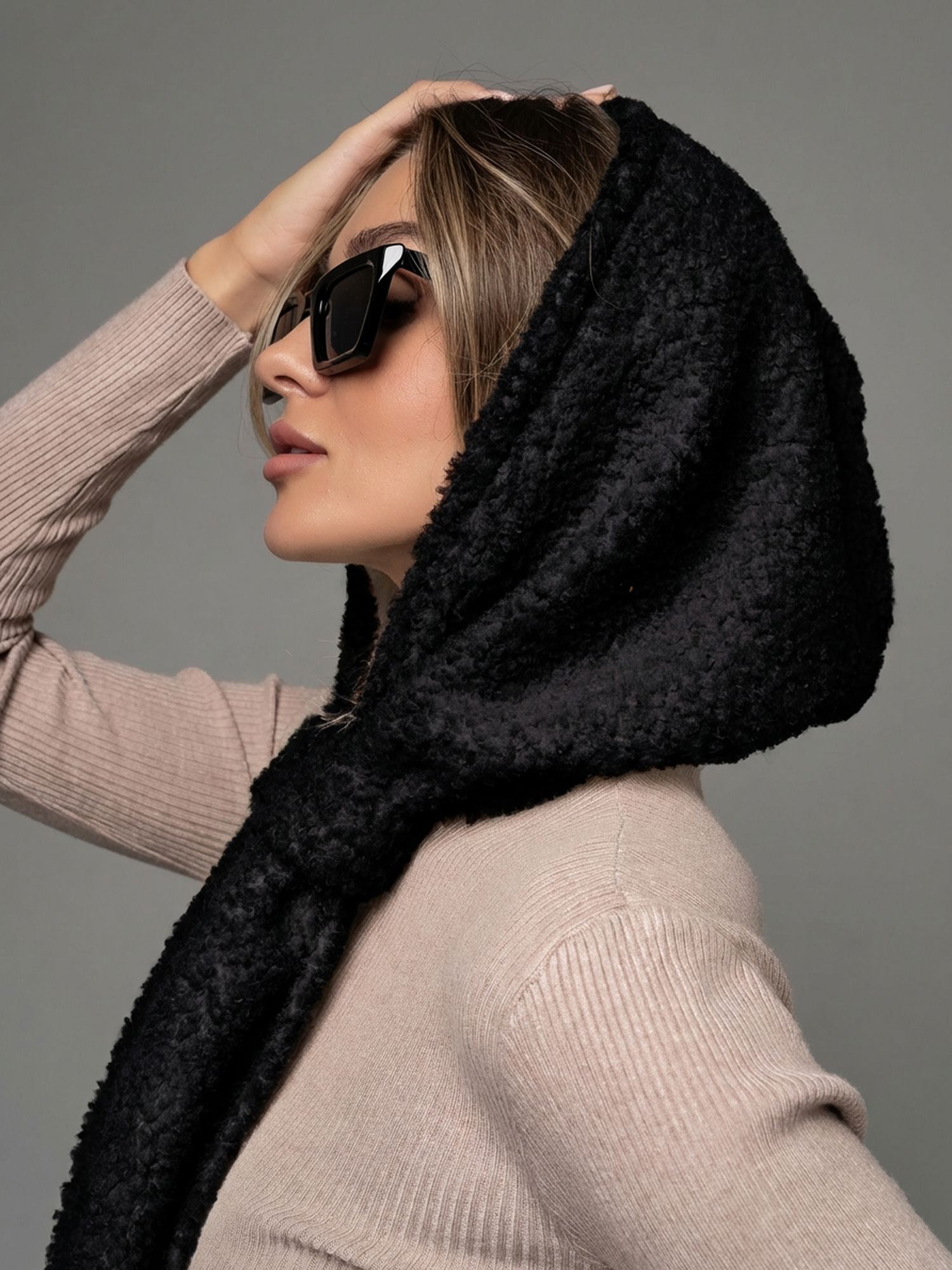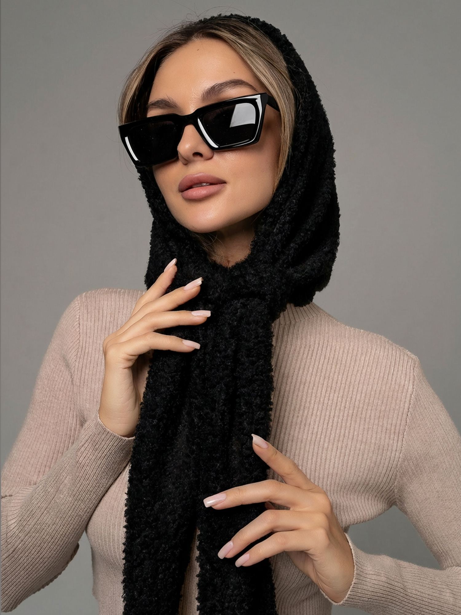 Капор - платок женский из шерпа черного цвета - тренд сезона. Имеет 2 варианта ношения: можно зафиксировать спереди на петличку, либо завязать как платок. Это универсальный головной убор, который сочетается с любой верхней одеждой, создавая стильный образ. Это отличная замена шапке, платку и шарфу, надежно закрывает шею и грудь от холодного воздуха. Плюшевый теплый капор из шерпы - идеален для длительных прогулок на свежем воздухе, путешествий, занятий спортом. В нем можно каждый день ходить на работу в офис, на учебу в школу или в институт. Не имеет ограничений по возрасту, подходит как взрослым, так и подросткам для повседневного, спортивного, городского, молодежного стиля. Капор можно взять с собой и надеть в случае непогоды весной и осенью."